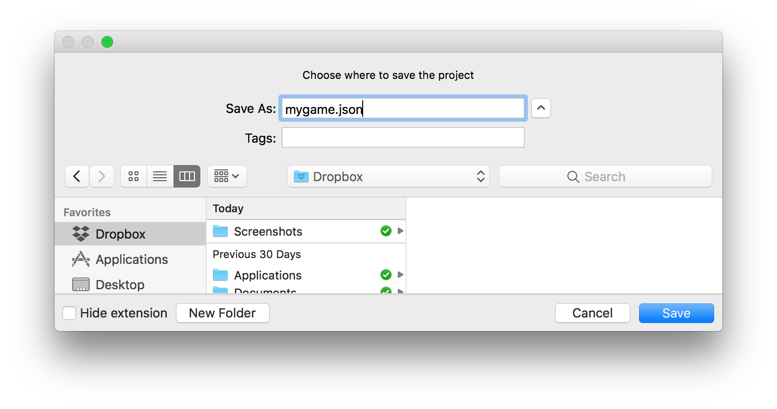 • Choose a folder, then enter a filename finishing by .json. For example: